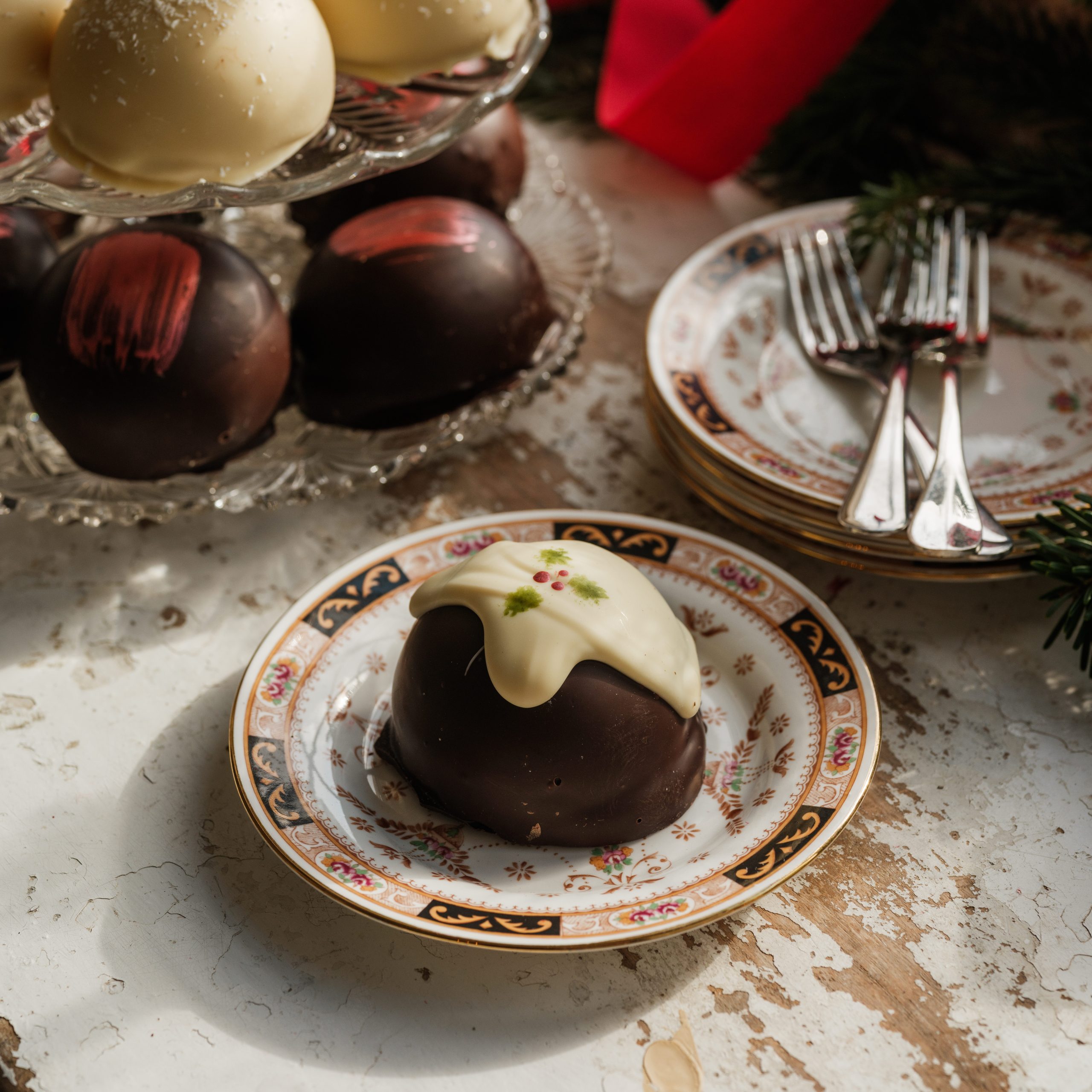 A playful twist on a festive classic, this Christmas Pudding Teacake is filled with our own foraged mincemeat. Handmade by La Fleur De Chocolat, they are handmade to resemble a traditional pudding, complete with decorative holly on top.