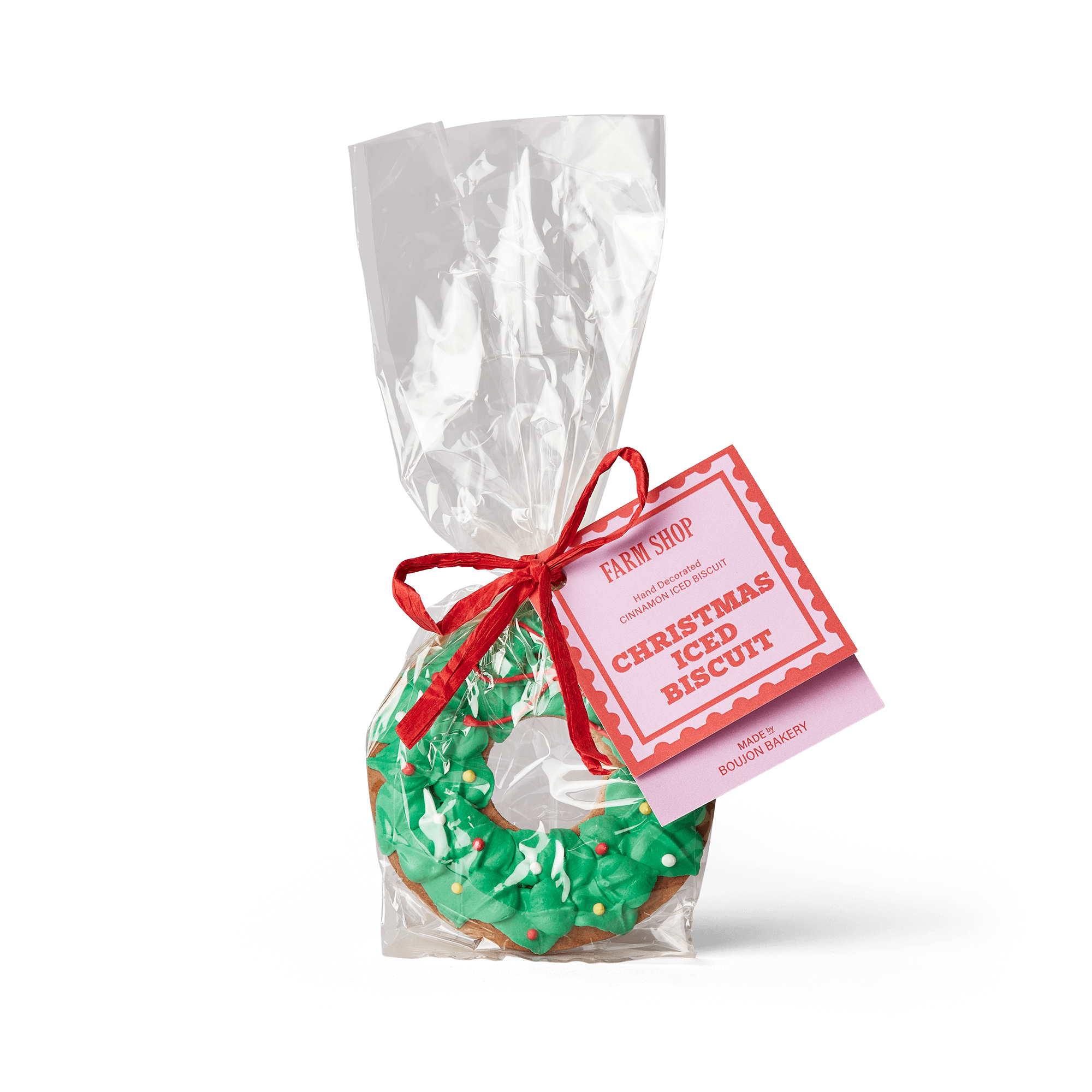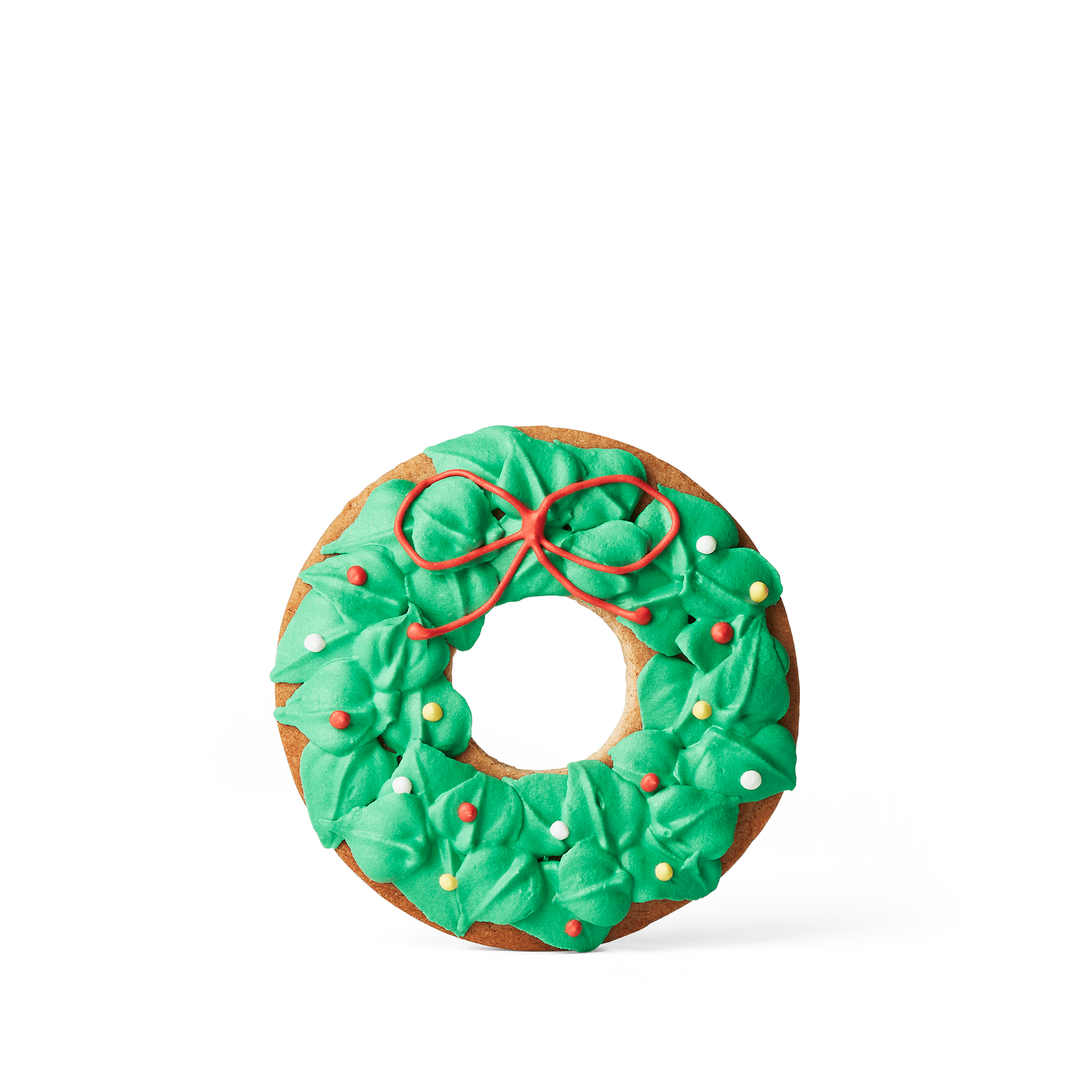 Delicately hand-decorated and perfectly sweet, this Christmas wreath biscuit is a festive treat for all ages.