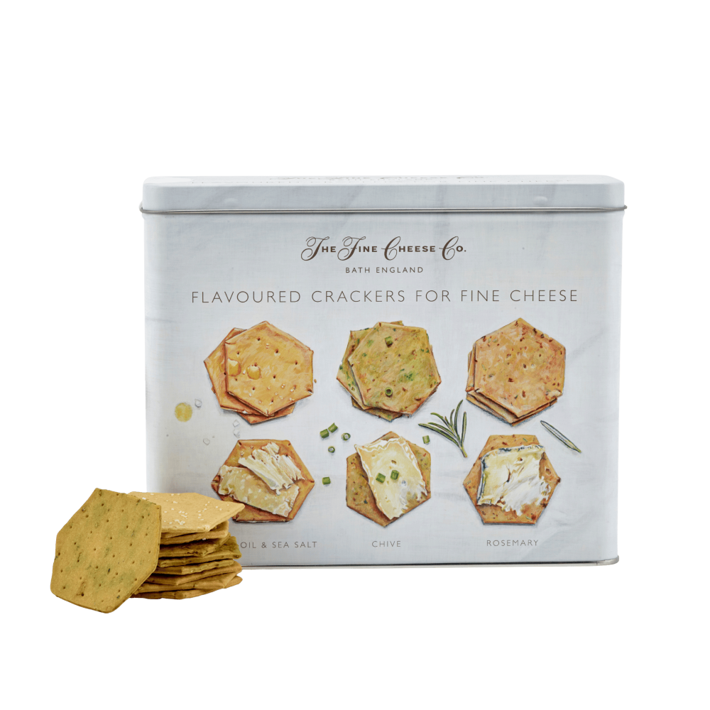 A delicious selection of crackers for eating with fine cheese, in a reusable tin to keep them fresh. Includes three flavours; Sea Salt, Rosemary, and Chive, perfect for pairing with a range of cheese, dips and charcuterie.