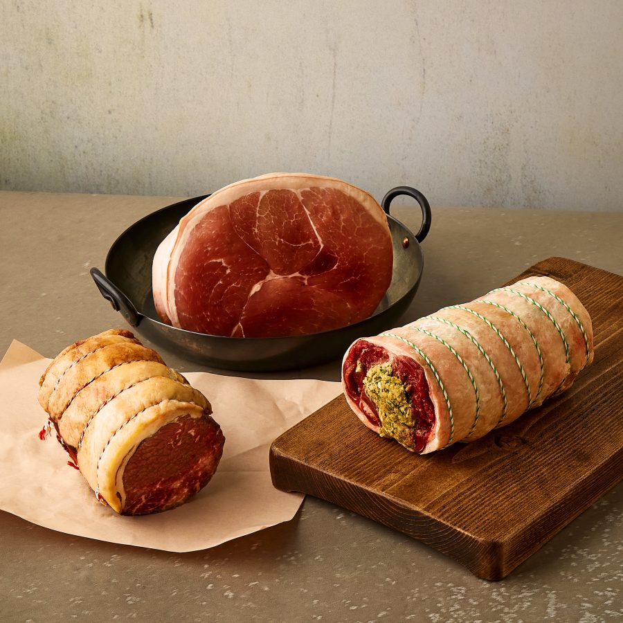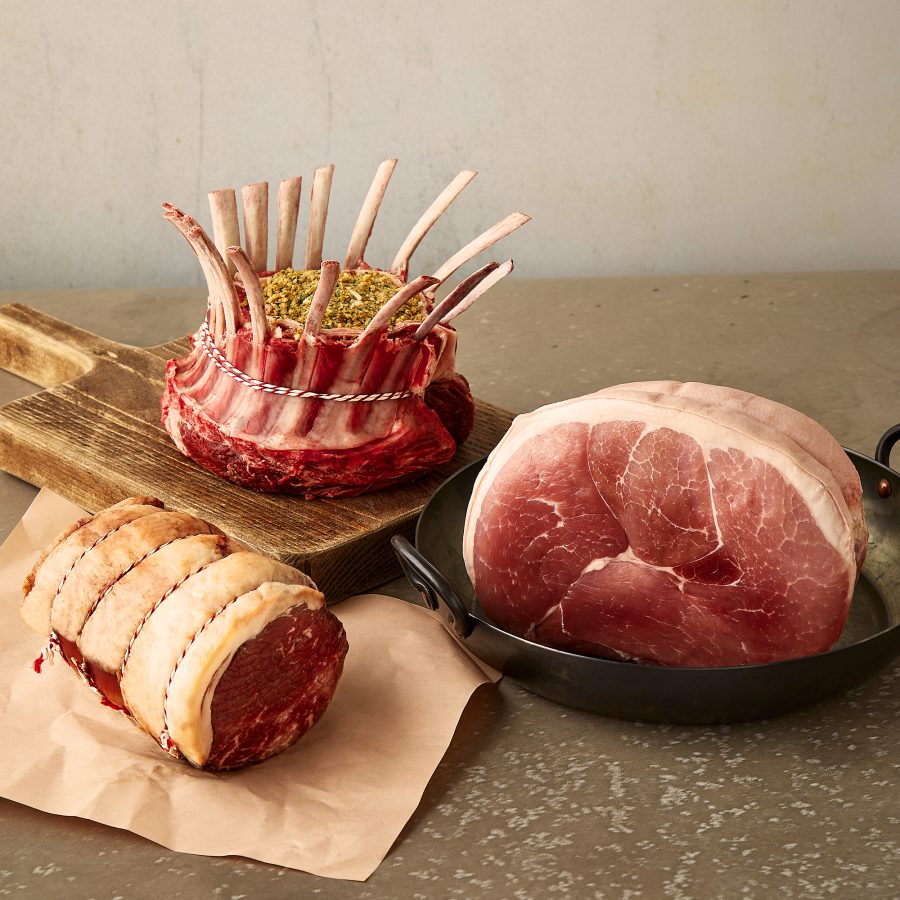 A curated collection of our favourite cuts: Topside of Beef for the perfect Sunday roast, a Gammon Joint for glazed ham, and your choice of either a Crown of Lamb with Apricot Stuffing or Wild Garlic Saddle of Lamb to complete your meat box.